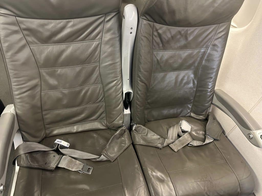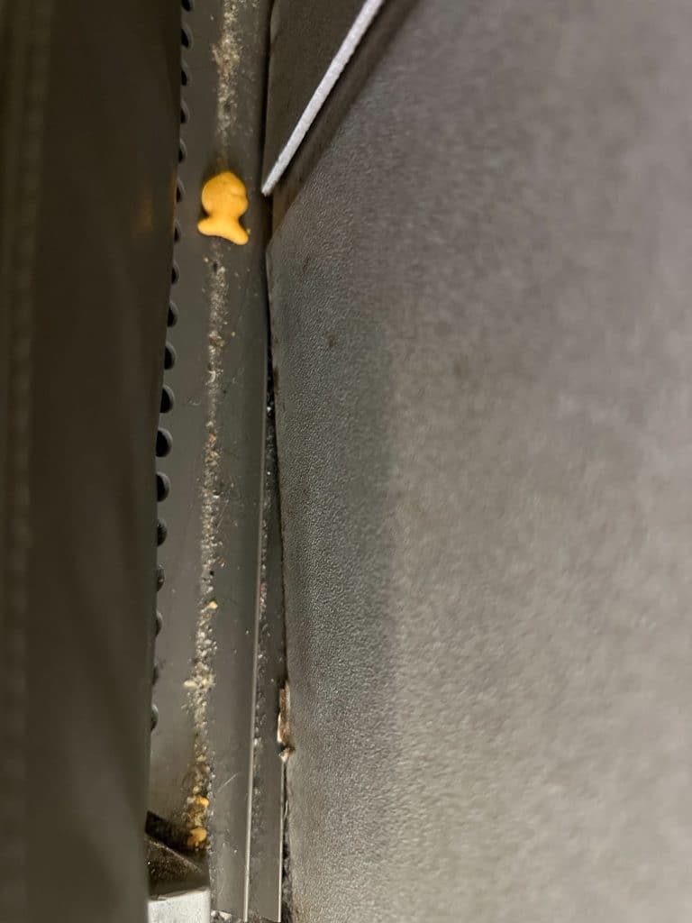 And then there was the issue of cleanliness—crumbs on the floor. Then to the left of the seat, goldfish, and to the right, Cheerios. It’s like a McDonald’s playpen/cereal bowl in the air. And you’re right there in it.